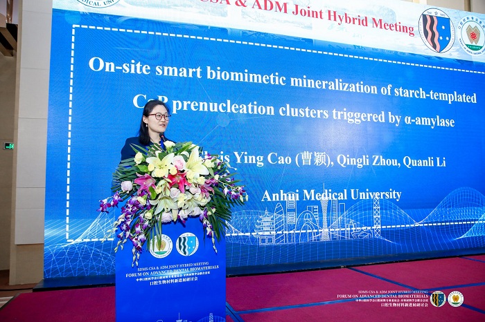 曹颖从仿生矿化修复硬组织缺损面临的问题、仿生矿化的背景进行讲解,作了关于“α-淀粉酶引发的淀粉支架CaP预成核团簇原位智能仿生矿化”课题的英文演讲。本课题安全有效,可精确调控的口腔响应型矿化体系的构建、可精确调控的口腔响应型矿化体系的矿化效果、可精确调控的口腔响应型矿化体系的长期保存,引起了大家的关注和热议。本次会议是由中华口腔医学会口腔材料专业委员会和牙科材料学会联合举办的是国际性会议,参会人员为国内外从事材料研究的科研人员,会议全程为英文演讲和交流。