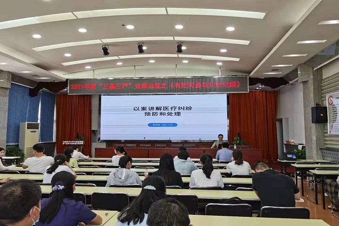 7月30日中午,街射 在健行楼六楼会议室举办2021年度三基三严法律法规篇之有效沟通与纠纷化解讲座,本次讲座邀请了安医大四附院医务部副部长、沟通办主任张磊授课,全院临床、医技、行政科室医务人员参加。