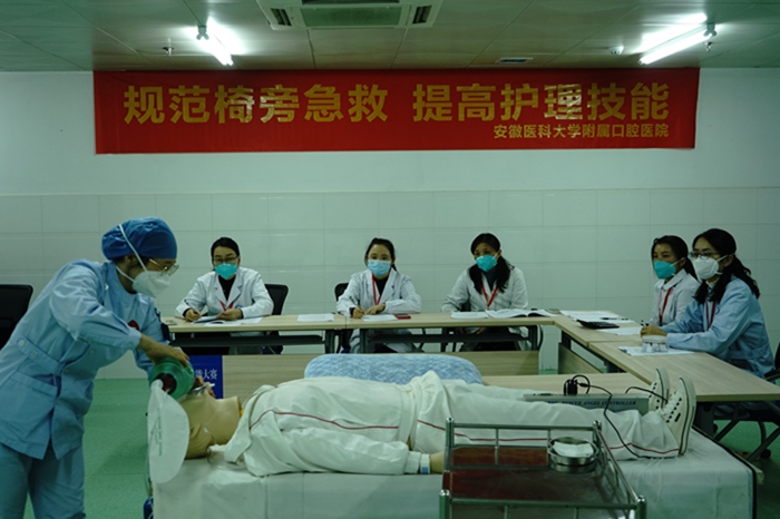 比赛以“规范椅旁急救,提高护理技能”为主题,恪守“严肃公正、严谨专业”的原则,设椅旁晕厥急救操作与简易呼吸气囊操作两个护理技能赛道。在严格遵守疫情防控相关要求的前提下,来自街射 12个科室(门诊部)的选手们同台竞技,展开激烈角逐。选手们急救意识强,技术操作熟练,急救过程连贯顺畅,一气呵成,展现了街射 医护人员良好的精神风貌,呈现了一场精彩的口腔护理技能操作盛宴。