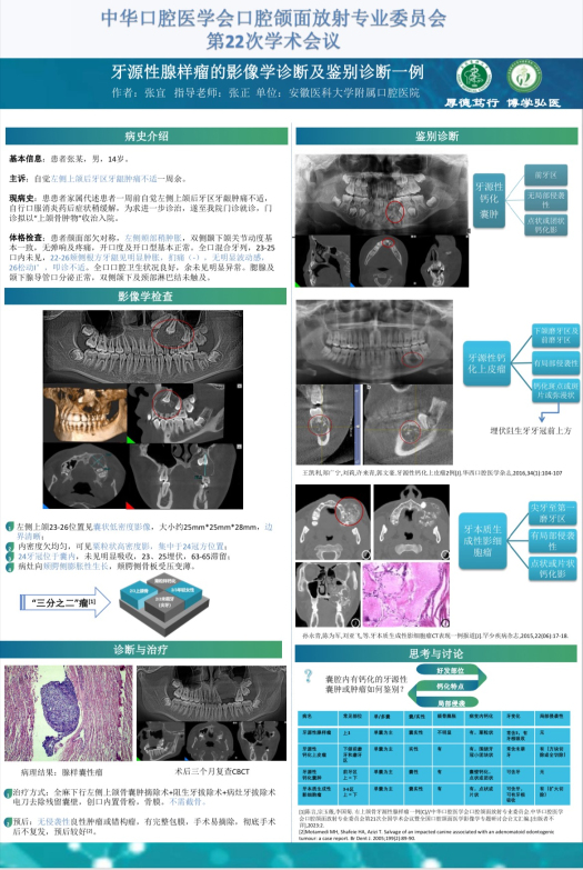会上,街射 放射科团队展示了壁报《牙源性腺样瘤的影像学诊断及鉴别诊断一例》和《多骨性骨纤维异常增殖症一例》。前者展示了较为典型的牙源性腺样瘤,通过其影像学表现、诊断与治疗过程,同具有相似影像表现的牙源性钙化囊肿、牙源性钙化上皮瘤及牙本质生成性影细胞瘤等作出了详细的鉴别诊断说明。后者通过多骨性骨纤维异常增殖症的影像学检查,介绍了骨纤维异常增殖症的不同影像学特征;并与骨囊肿、骨巨细胞瘤、非骨化性纤维瘤等作出了详细的鉴别诊断说明。两幅壁报的展示赢得了与会专家的高度认可和广泛赞誉,分别获得三等奖、优秀奖。