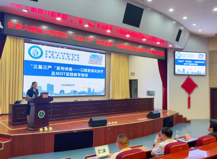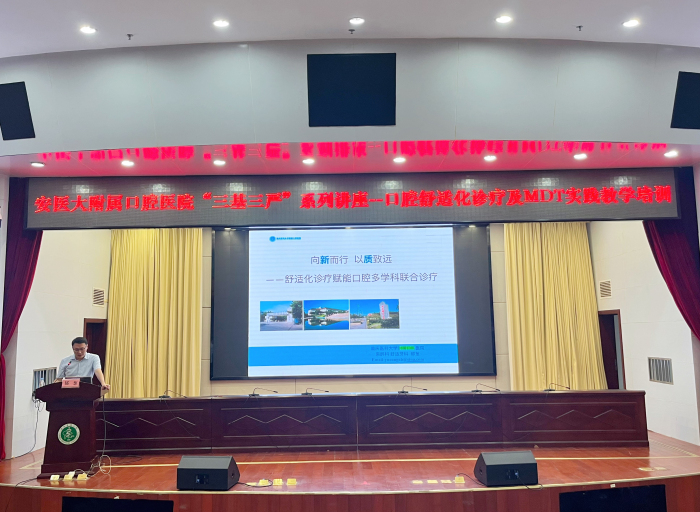 8月7日上午,街射 在校图书馆第一学术报告厅举办“口腔舒适化诊疗及MDT实践教学”讲座。重庆医科大学附属口腔医院麻醉科主任郁葱、无锡市口腔医院颌面外科主任吴俊来院授课并答疑。副院长徐文华出席讲座,副院长曹颖主持。