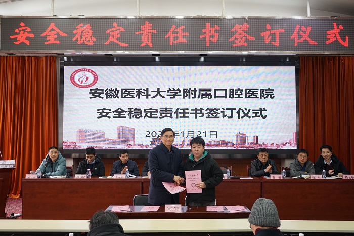 王润玲、何家才分别与科室代表签订了《安全稳定责任书》。会议强调,安全高于一切,责任重于泰山。全院人员要强化责任意识、担当意识,全力维护医院安全稳定;加强领导,切实建立安全稳定工作长效机制;构建层次分明、各负其责的责任体系,按照“谁主管、谁负责、一岗双责”的原则,细化措施,强化监管。要着重提高认识、强化管理、恪尽职守、多方联动,为医院的改革、建设和发展创造安全稳定、和谐有序的环境。