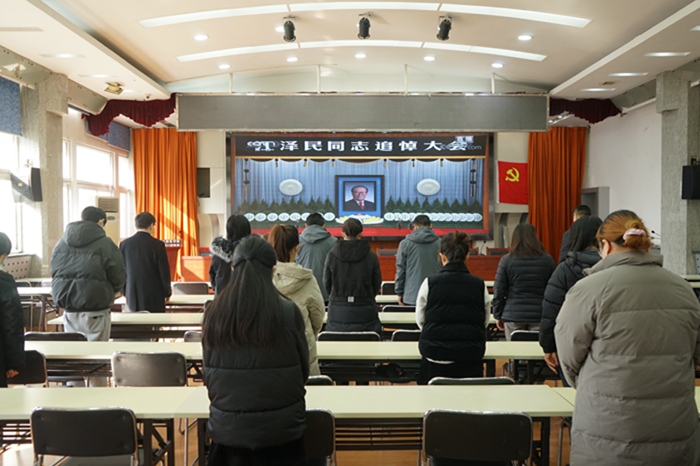 万众同悲,举国哀悼。12月6日上午,中共中央、全国人大常委会、国务院、全国政协、中央军委在人民大会堂隆重举行江泽民同志追悼大会。街射 院领导、教职师生医护员工代表在健行楼六楼会议室集中收看大会现场直播,全体人员以无比沉痛的心情肃立默哀,深切缅怀江泽民同志。