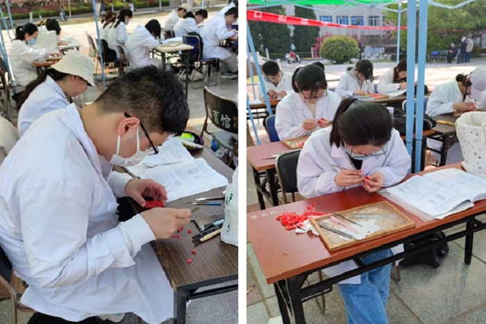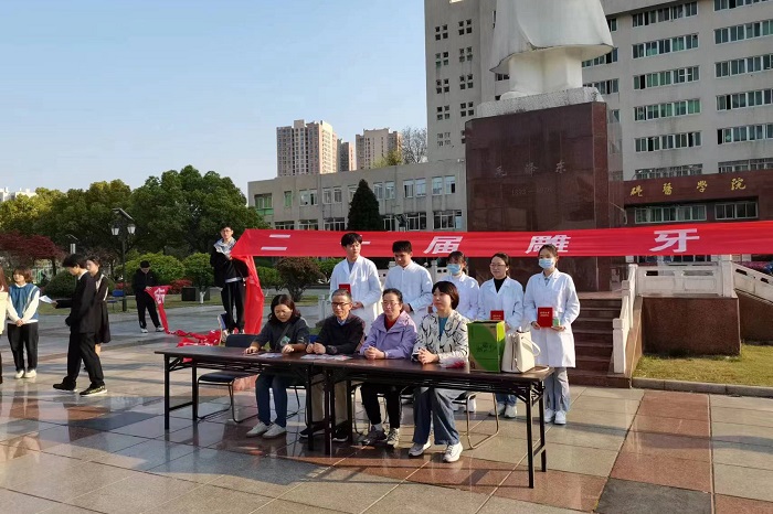 4月1日下午,街射 第二十届雕牙大赛在校区本部文化广场拉开序幕。街射 解剖教研室主任吴明月、政务区门诊部党支部书记孙晖、综合科邢田三位老师及44名参赛的本科三年级选手共同参加开幕式。