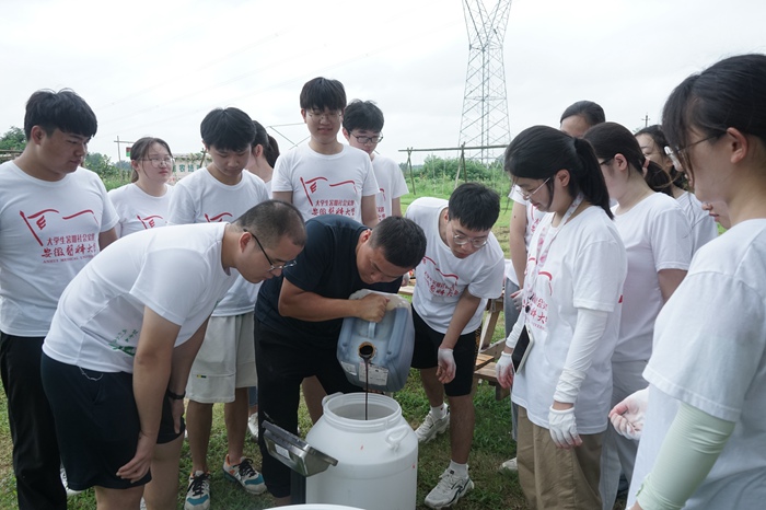 在马郢情圆农场,梁朝朝一行参观了实践团队开展的“制作环保酵素”活动,观看了同学们将果蔬残次品、厨余垃圾等通过“再生产”“再利用”,变成有机肥料、环保驱虫剂和洗护用品等产品的过程,并勉励大家在劳动实践中磨砺意志、增长技能,厚植用火热青春投身乡村振兴伟大实践的高尚情怀。