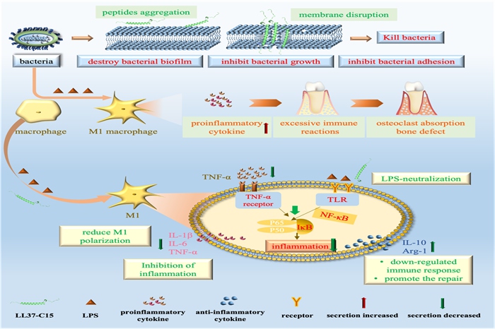 牙周炎被报道为人类的第六大常见疾病,这种破坏性疾病与全身性疾病密切相关。现有的牙周炎局部给药系统存在抗菌效果和耐药性较差的缺点。受牙周炎发病机制的启发,该团队构建了双功能多肽LL37-C15,该多肽对牙龈卟啉单胞菌和伴放线聚集杆菌具有显著的抗菌作用。此外,LL37-C15通过控制炎症通路和逆转巨噬细胞M1表型的分化来抑制促炎细胞因子的释放。通过体内外的实验结果显示,LL37-C15 具有高活性、低毒性的优点,在牙周炎微环境中表现出良好的抗菌和抗炎性能。双功能多肽的构建以及优异性能为细菌感染性疾病的研究提供了一个分子生物学平台,也为牙周炎等病因复杂的疾病提供了新的治疗方法。