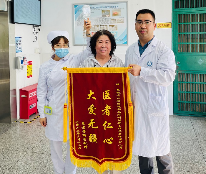 6月12日上午,街射 口腔颌面外科收到住院患者晋某送来的一面写着“医者仁心,大爱无疆”的锦旗,感谢陈新主任及颌面外科全体医护人员对其在住院期间的精心治疗和细心照护。
