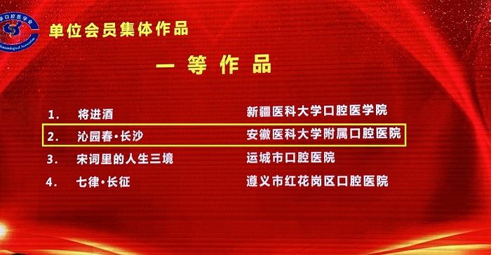 在“5·30中华口腔医学会会员日暨全国科技工作者日”会员诗词朗诵环节,由街射 望湖城门诊部姚育智、教学管理办公室王烨、牙体牙髓科马腾飞和政务区门诊部孙晖4位老师朗诵的作品《沁园春·长沙》,以雄厚的实力荣获一等奖。