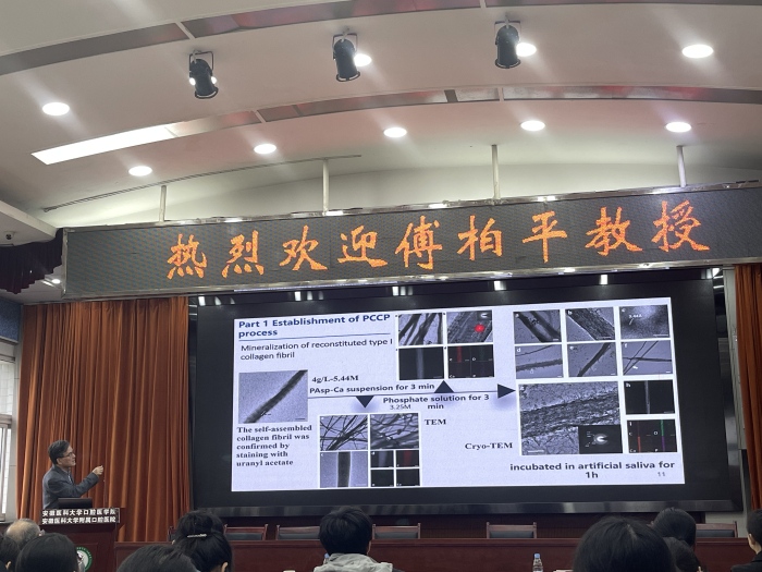 傅柏平以“聚电解质阳离子复合体前前驱体(PCCP)矿化途径及其潜在的临床应用价值”为题,介绍了“先聚电解质钙复合体后磷”的矿化途径。该PCCP矿化途径将生物矿化的经典和非经典结晶理论相结合,是一种可快速实现胶原纤维内矿化的全新矿化途径。傅柏平先从该新矿化途径的发现谈起,详细讲解了其课题组于该新矿化途径下的一些列仿生矿化的研究,并介绍了通过该新矿化途径发明的一种速效持久的牙齿脱敏剂。讲座中傅柏平提到科学研究的临床转化问题,强调把科学研究成果转化为临床应用,旨在尽快把科技成果转化为能够造福病人的实际成果。与会专家与傅柏平就目前胶原纤维仿生矿化研究方面问题展开深入交流。