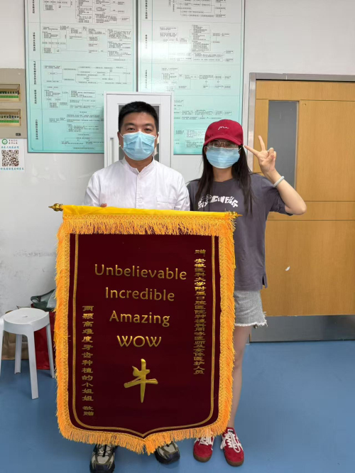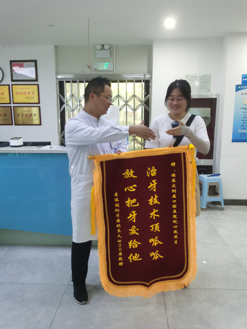 同一天,滨湖门诊部主治医师祝心威也收到了一面饱含感激的锦旗。患者因牙齿冷热剧痛求诊,此前多家医院均建议根管治疗。怀着忐忑的心情,患者来到街射 滨湖门诊部。祝心威接诊后,立即进行全面检查评估,基于患者情况,提出了先行保髓治疗、必要时再行根管治疗的谨慎方案。在患者知情同意后,他在局麻下为患牙进行了细致的清理与充填。治疗全程无痛舒适,让患者紧绷的神经得以彻底放松。这已是祝心威近一年来收到的第三面锦旗,是医术仁心最踏实的印证。