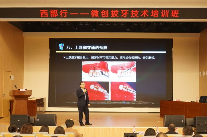 压轴课程由西安医学院街射 院长、三秦英才特支计划科技创新领军人才刘昌奎教授担纲,他就拔牙术后疼痛、牙齿移位、上颌窦相通以及肿胀、感染、张口受限等系列并发症进行了系统剖析,并提供了全面的临床应对方案。