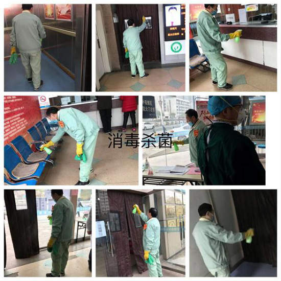 疫情来势汹汹,防控刻不容缓。总务科第一时间启动应急机制,安排保洁人员做好自身防护的同时对街射 公共区域进行消毒处理,室内消毒以喷洒、擦拭方式为主,并对卫生间、电梯及其按钮、候诊椅、门帘、门把手等容易发生交叉感染的部位进行重点消毒。严格消毒时间间隔,坚持每天消毒,把感染扼杀在源头上。