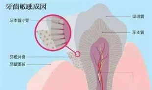 牙齿是由成千上万个微小的管道组成,并通过管道与内部神经相通,以此来感受外界的刺激。其中牙釉质的微管管径相对较小,牙本质的管径较大。在牙颈部和牙根处的釉质覆盖较少,甚至缺如,当人们罹患牙周疾病时,牙齿的根面就会暴露出来,在缺乏釉质覆盖的地方就会异常敏感。