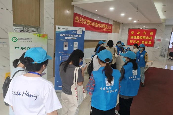 大红的迎新标语,标志性牙齿卡通造型,整洁有序的防疫物品,简单易懂的身份核验,工作人员和志愿者们积极为远道而来的新生提供帮助。志愿者们一对一与研究生新生对接,引导同学们依次进行人像识别、身份核验、证件审查、材料领取,直至完成报到程序,并热情帮助搬运行李,送至各自寝室。