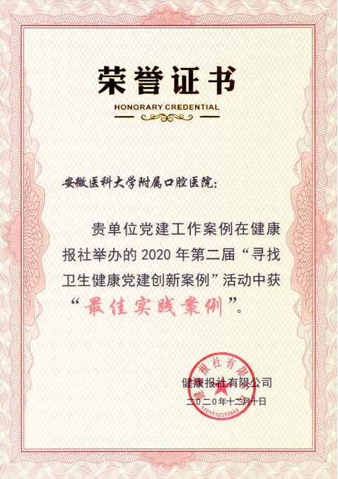 12月10日,由《健康报》主办的第二届卫生健康党建工作主题交流与宣传大会在南京举行。附属口腔医院申报的《医路跟党,医路前行,推进大学附属医院高质量发展》党建工作案例从全国500多个案例中脱颖而出,荣获2020年第二届寻找卫生健康行业党建创新案例“最佳实践案例”大奖。