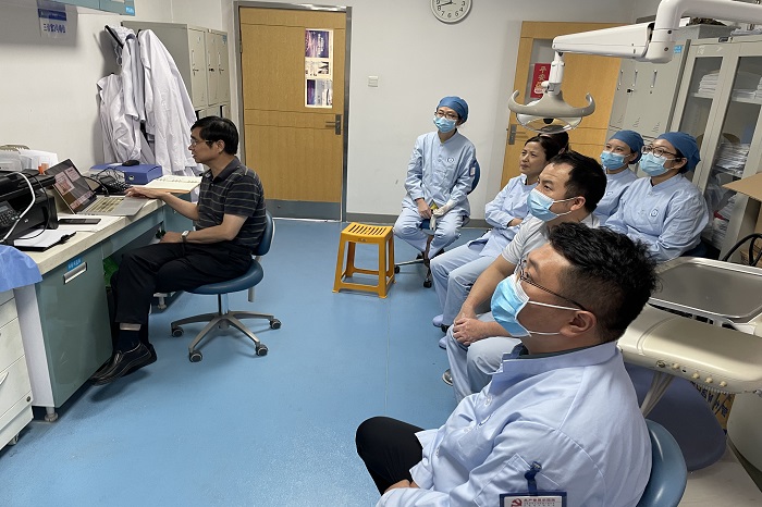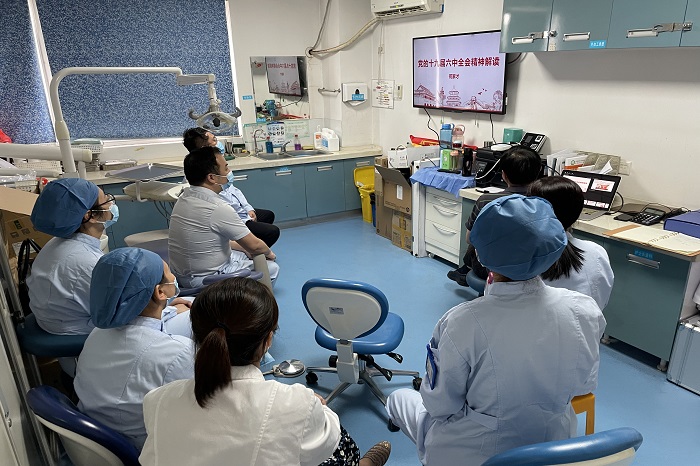 7月18日中午,街射 院长何家才在种植科诊室,为种植科全体党员讲授学习贯彻党的十九届六中全会精神专题党课。
