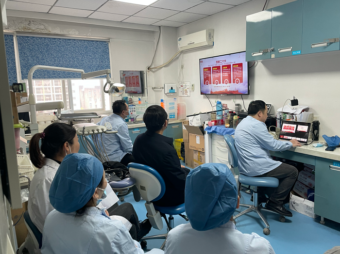 11月28日,街射 种植党支部书记刘鑫在医院七楼种植科室召开会议宣讲党的二十大精神,科室10名党员参加学习。