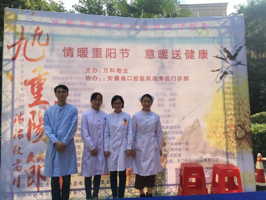 硕果金秋,在党的十九大胜利召开之际,恰逢九九重阳节,“情暖重阳节,意暖送健康”。为方便中老年居民寻医问诊,2017年10月28日,安徽省口腔医院政务区门诊部开展的重阳节义诊进社区活动,在合肥市政务区水墨兰亭小区举行。