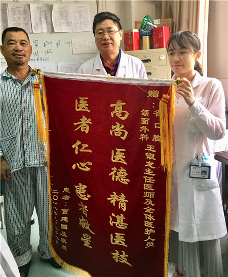 据了解,患者贾建国曾因右下颌磨牙后区小溃疡面经久不愈,近期疼痛加剧。王主任经过仔细检查,详细询问病史,并迅即将患者收住入院,完善入院检查后很快安排活检手术,病理结果提示确实存在早期恶变。王主任又马上安排手术,手术顺利,术后又多次查看病人恢复情况,给与患者以精神鼓励,患者康复出院。