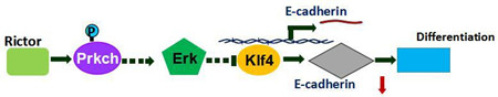 21世纪是生命再生医学的年代,干细胞研究起到了重大的推动作用。对于干细胞的研究,有助于阐明许多重大疾病的发病原因,在干细胞的研究中干细胞如何自我更新(Chambers and Smith, 2004)(也称为干性维持)以及如何调控其多种分化潜能是其热点和难点,街射 朱友明课题组首先比较Rictor在MEF和R1-ES细胞中的表达,发现Rictor在R1细胞中表达显著低于MEF细胞,随后在R1这种无需饲养层的干细胞中敲低目的蛋白Rictor的表达水平,加入RA(1uM)处理或者不加RA处理,发现敲低Rictor后R1不分化,过表达Rictor会诱导干细胞R1分化,在IPS的诱导过程中Rictor表达水平下调,而在RA诱导R1分化过程中Rictor表达水平上调。以Rictor为靶蛋白通过免疫共沉淀验,并进行质谱分析发现Prkch与Rictor相互作用,同时发现过表达Prkch会诱导干细胞R1分化,进一步的研究发现Rictor通过促进Prkch642位丝氨酸磷酸化,而642位丝氨酸磷酸化的Prkch进一步影响Klf4295位丝氨酸磷酸化,从而导致Klf4转录活性的变化,抑制Klf4依赖E-cadherin的表达,随后导致ES细胞分化。该研究结果表明,Rictor-Prkch-Klf4通路在调节ES细胞分化中具有重要作用,为未来研究mTORC2对干细胞分化的影响具有一定的指导意义。
