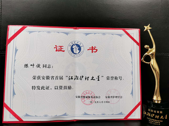6月14日晚,由安徽省健康服务业协会、安徽省护理学会主办的首届“江淮护理之星”颁奖盛典在芜湖市隆重举行。 街射 护理部主任陈叶俊凭借雄厚的实力和良好的口碑,通过单位推荐、网络投票和专家评议程序,最终脱颖而出,被授予安徽省首届“江淮护理之星”称号。