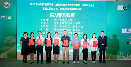 本次大会设置教育教学方法、虚拟仿真教学和思政教育三个分论坛,同时组织全国口腔院系青年教师进行授课技能和本科生临床操作技能展示,引导各院校重视师资授课技能的提升,注重口腔医学本科生临床操作技能的规范化培养。同期召开了第五届口腔医学教育专委会工作会议。种植科教师周咏在授课技能展示中,精彩顺畅的表现得到专家一致认可,最终获评“实力非凡教师”奖。本科生临床操作技能展示中,16级本科生吕浩东代表学院参赛,获评“进步之星”。