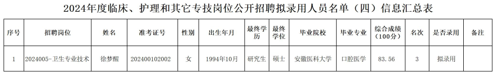根据街射 2024年度临床、护理和其它专技岗位招聘公告,经过网上报名、笔试、资格审核、心理健康测评、面试等环节,按照择优录用的原则,并经体检(因怀孕延迟)和考察合格,拟录用徐梦醒,现予以公示。